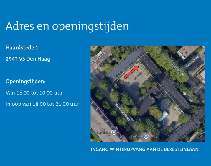 Deze locatie bevindt zich aan de Haardstede 1 Den Haag. Met de ingang aan de Beresteinlaan. Er is plek voor 100 mensen. Dakloze mensen kunnen hier binnenslapen, bij gevaarlijke weersomstandigheden, zoals vrieskou en storm. Vanaf 18:00 uur staat er een warme maaltijd en een veilige slaapplaats voor hen klaar. Ook kan er warm worden gedoucht. De volgende ochtend sluit de opvang om 10 uur na een ontbijt. Er is zorg, begeleiding en beveiliging aanwezig.
