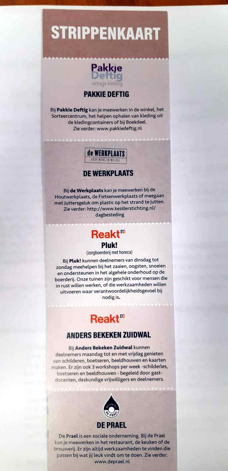,,Simpel, praktisch en werkzaam”, reageert Jan Koppen van De Prael; een van de aanbieders die op de strippenkaart staat afgedrukt. Bezitters van de strippenkaart kunnen zich, met de kaart in de hand, bij hem melden voor een eerste gesprek over werk. Ze kunnen ook naar een houtwerkplaats, een zorgboerderij of een tweedehands kledingwinkel om laagdrempelige werkzaamheden met begeleiding te vinden.