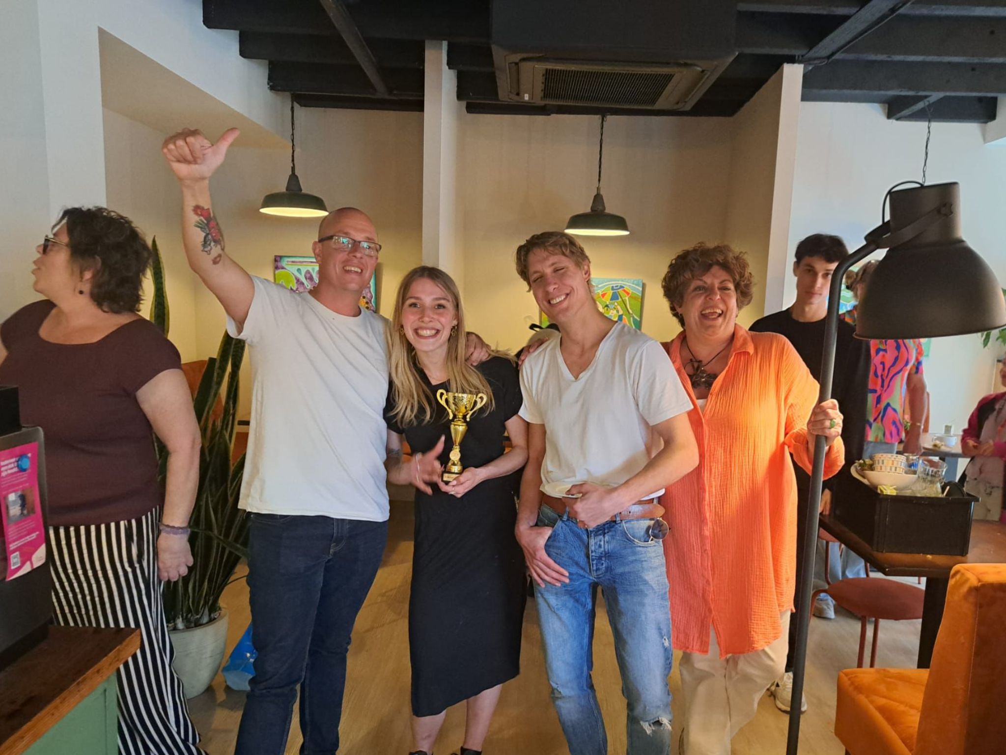 Trotse prijswinnaars Jeroen, Fleur en Joshua met juryleden Thecla en Monica.