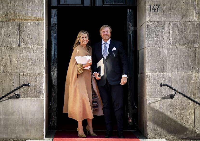 Koning Willem-Alexander en Koningin Máxima komen aan bij het Koninklijk Paleis Amsterdam, waar zij de traditionele Nieuwjaarsontvangst houden voor Nederlandse genodigden.