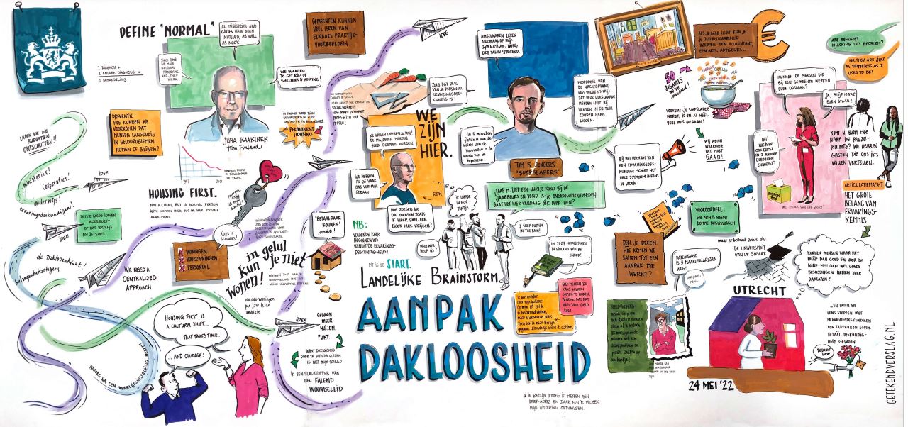De brainstorm was een inspirerende aftrap voor de aanpak dakloosheid 2023-2030. Alle ideeën die deze middag zijn ingebracht worden momenteel verwerkt. De komende maanden wordt er verder gewerkt aan de aanpak van dakloosheid. Half juni worden de concrete vervolgstappen tot aan november bekend gemaakt. Op 21 november 2022 wordt de aanpak op het volgend landelijk congres dakloosheid gepresenteerd.